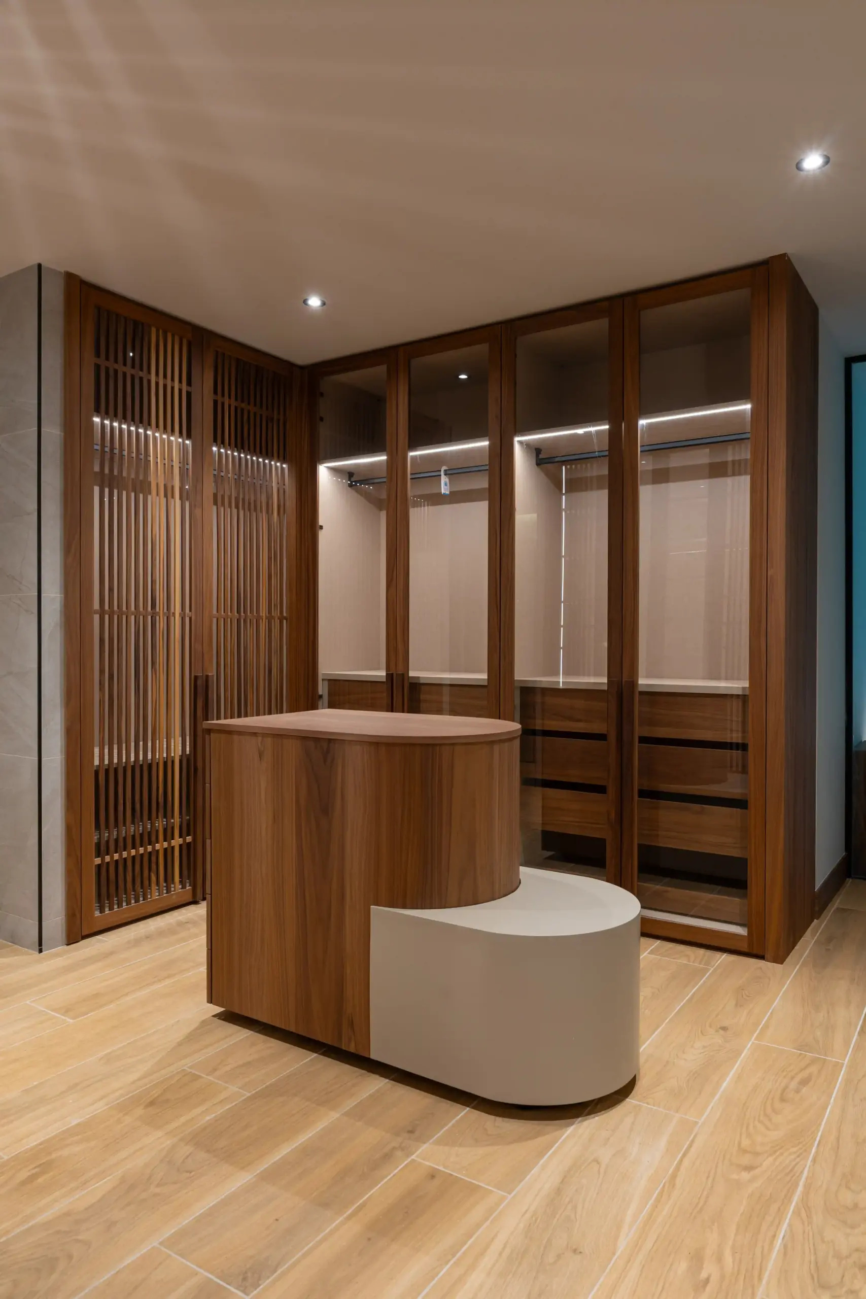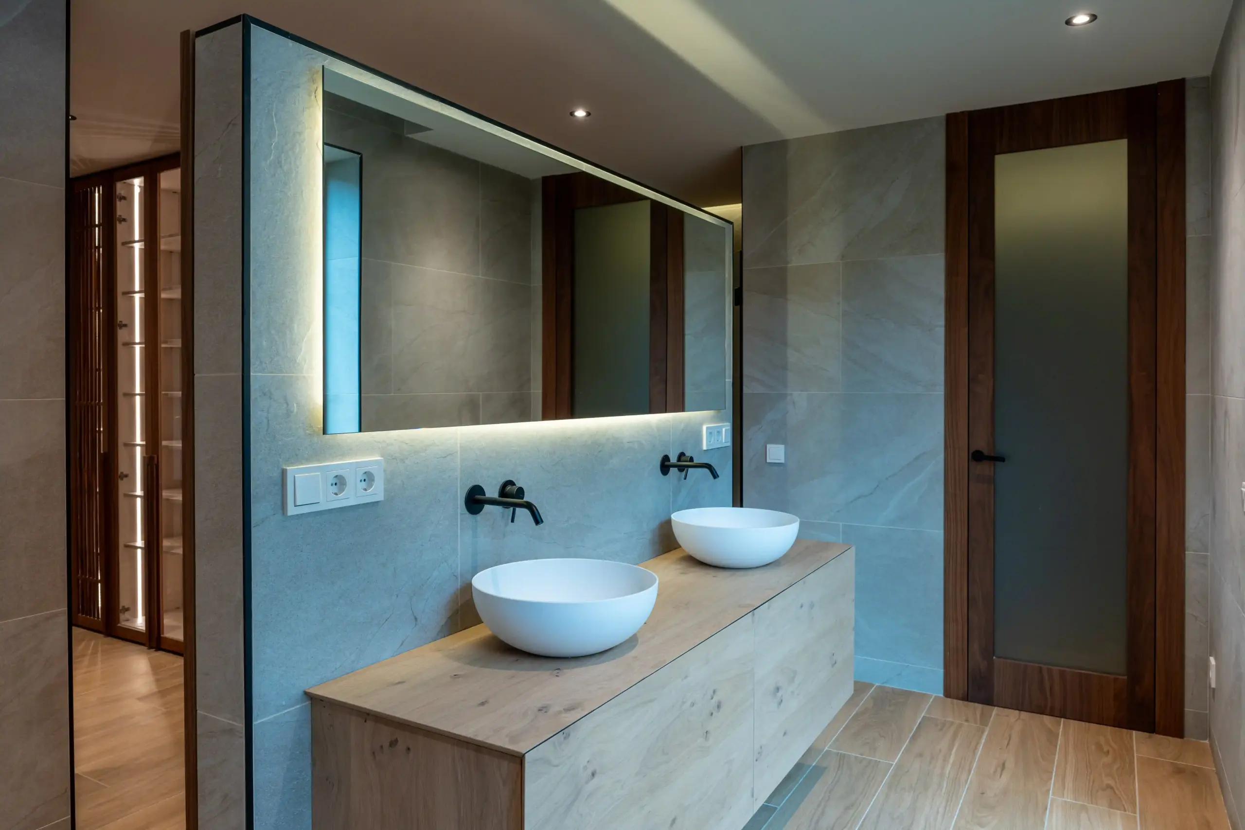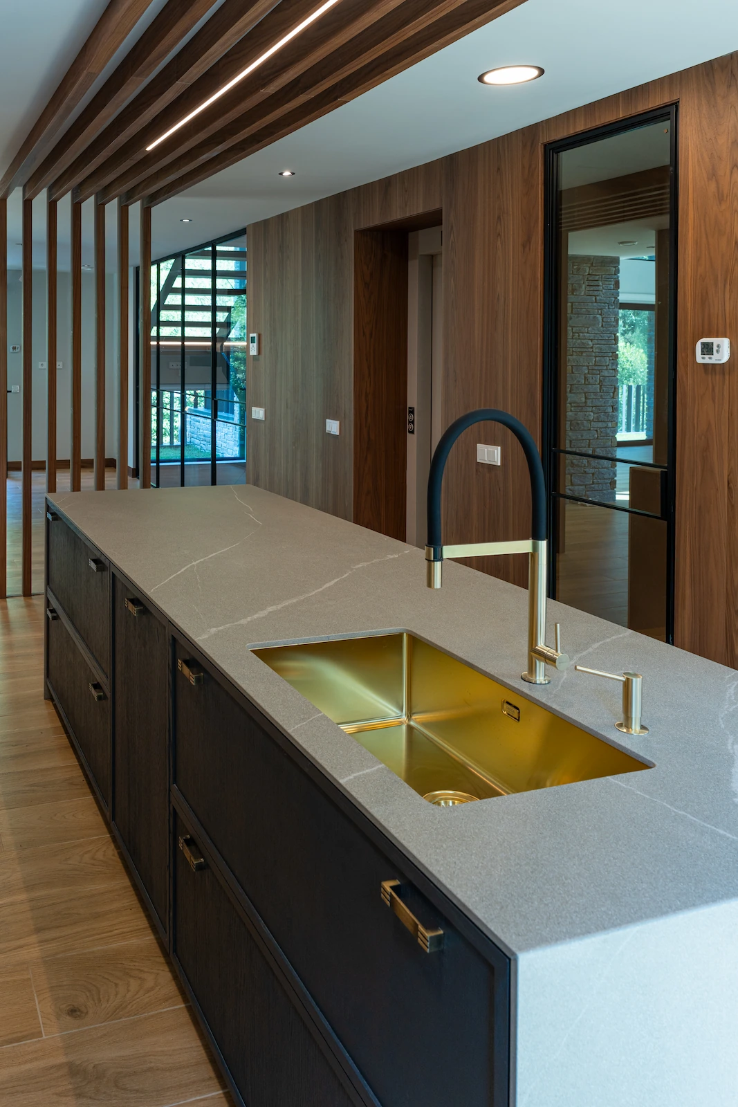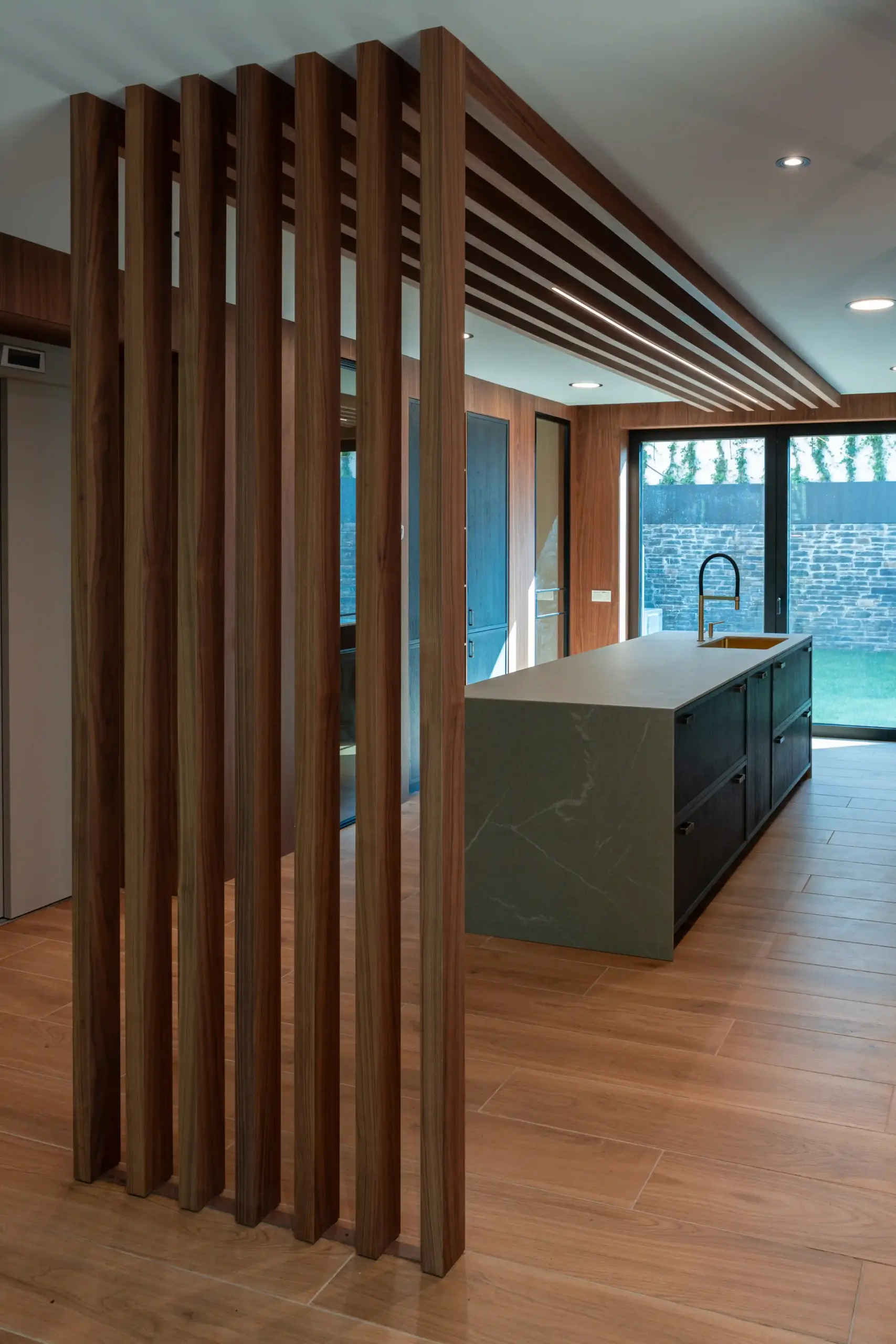 Diseño de cocina cálida, con un toque personal y carpintería interior en madera de nogal. Muebles a medida en el salón y en los baños, escaleras, vestidores, puertas y armarios de suelo a techo, así como panelados y hornacinas en los dormitorios.