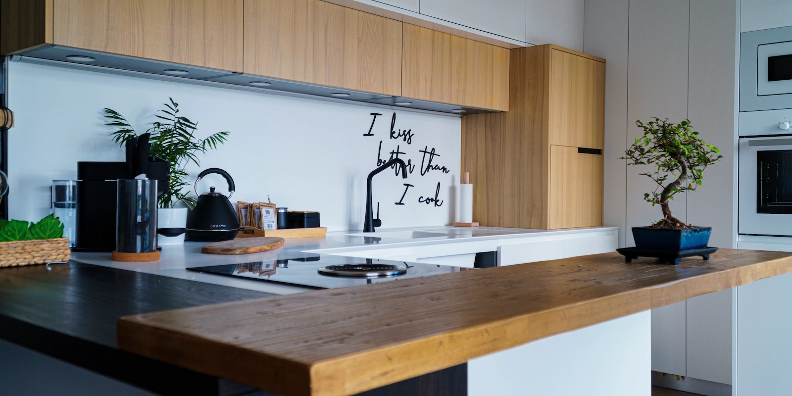 Diseño de cocina clásica en forma de L con isla y carpintería interior. Puertas plafonadas lacadas en blanco con herrajes en negro, y armarios abatibles de suelo a techo, también lacados en blanco.