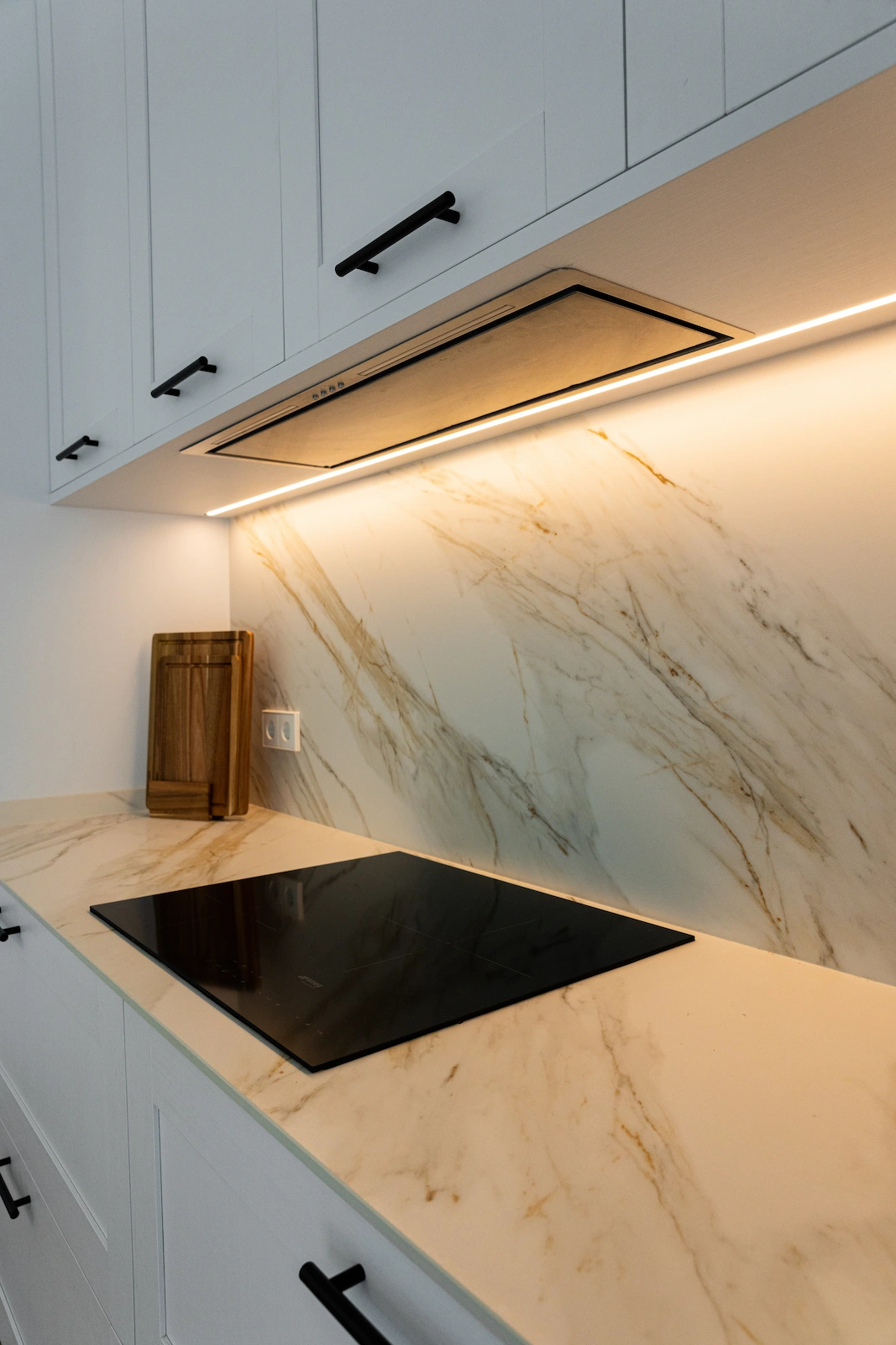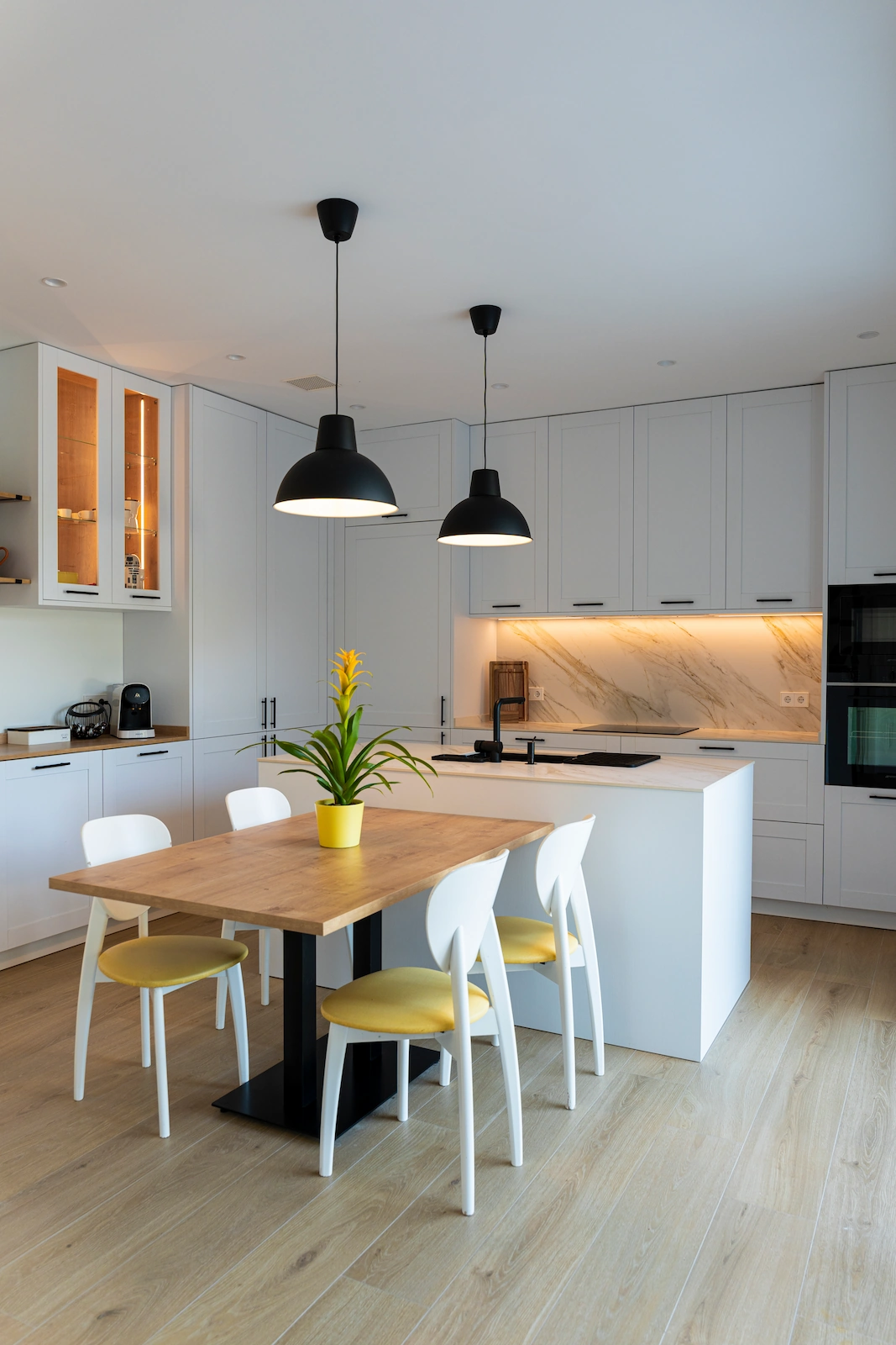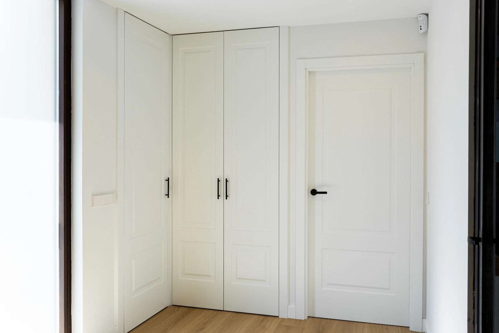 Diseño de cocina clásica en forma de L con isla y carpintería interior. Puertas plafonadas lacadas en blanco con herrajes en negro, y armarios abatibles de suelo a techo, también lacados en blanco.