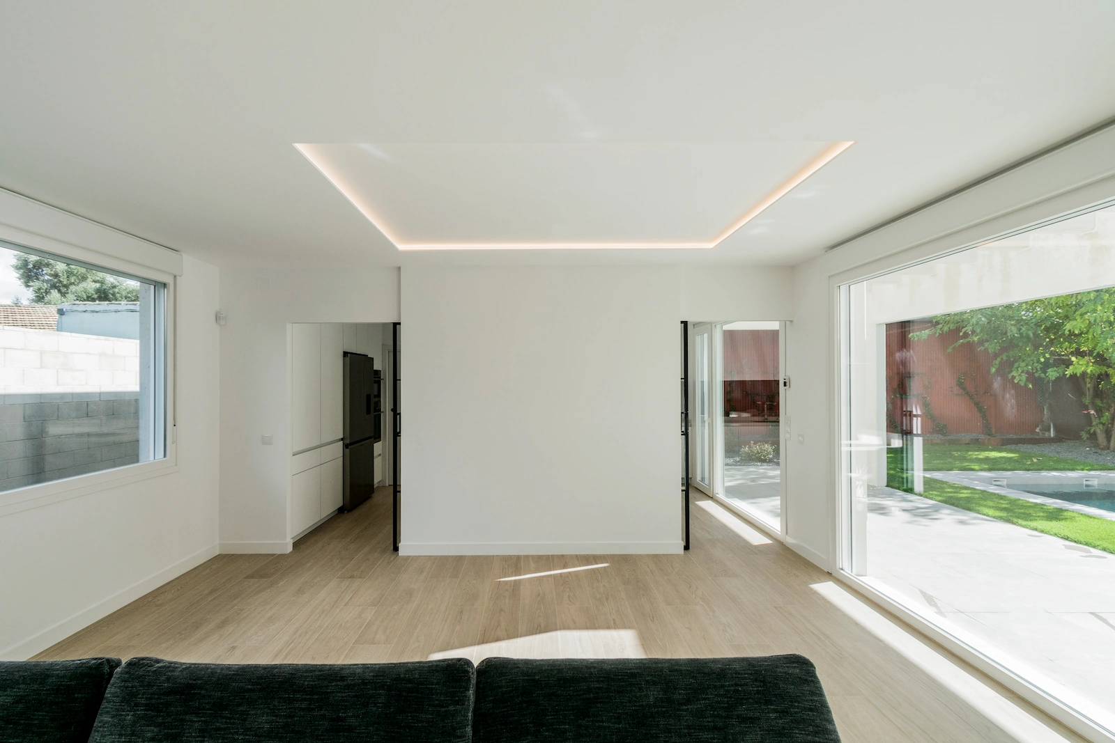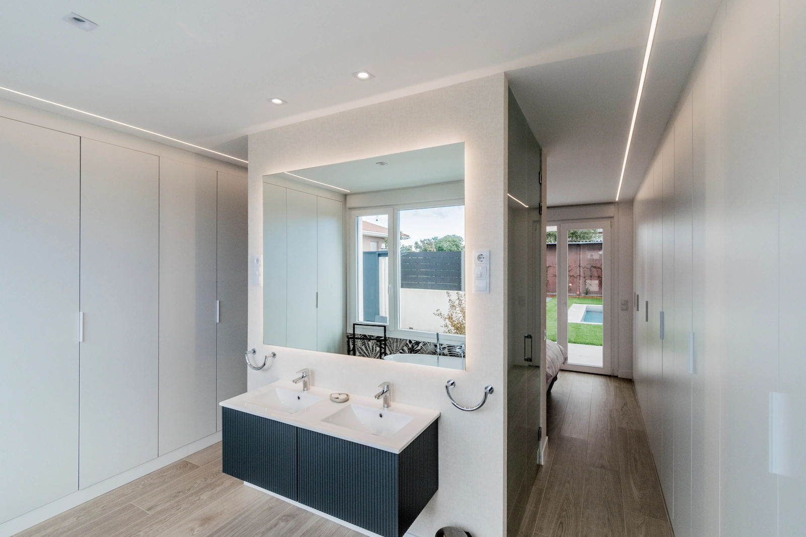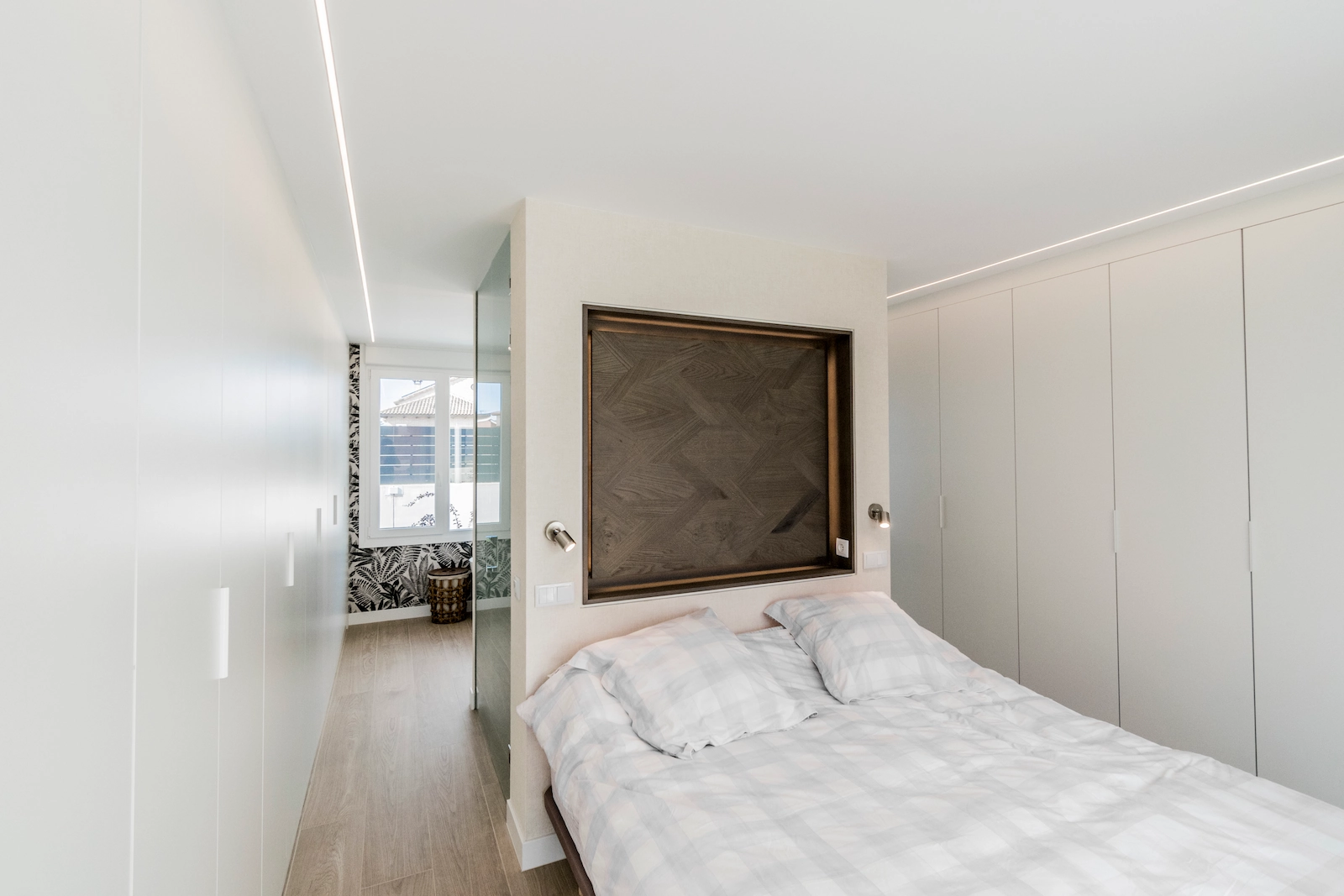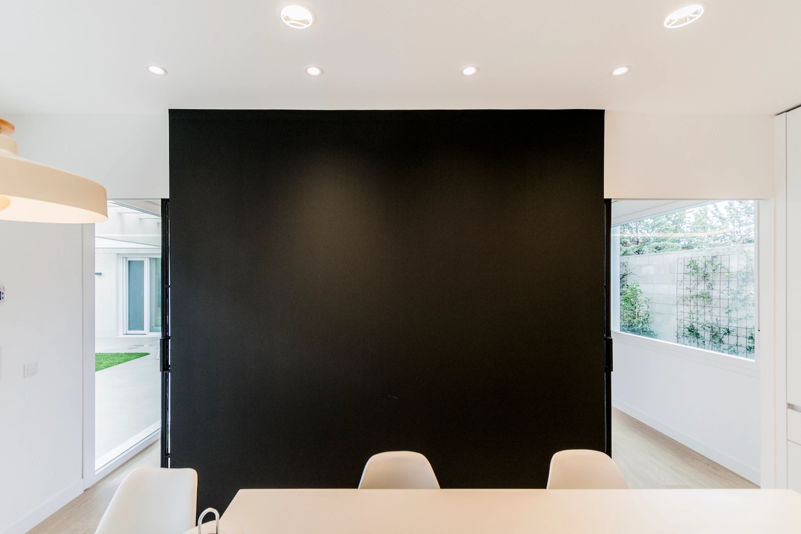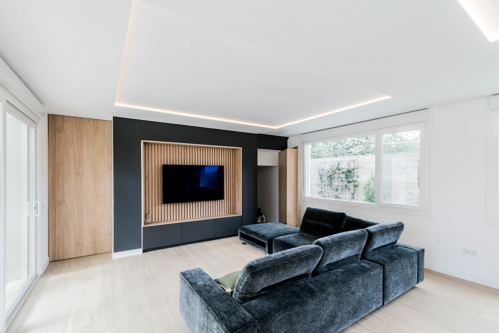 Diseño de cocina minimalista en blanco, con encimera de Silestone Blanco Zeus y carpintería interior. Librería en el salón con puerta oculta que da acceso al espacio bajo la escalera, combinada en madera y negro, con palillería de madera retroiluminada en la zona de la televisión. Armarios en blanco que continúan con la línea minimalista de toda la vivienda, en coherencia con las puertas de paso.