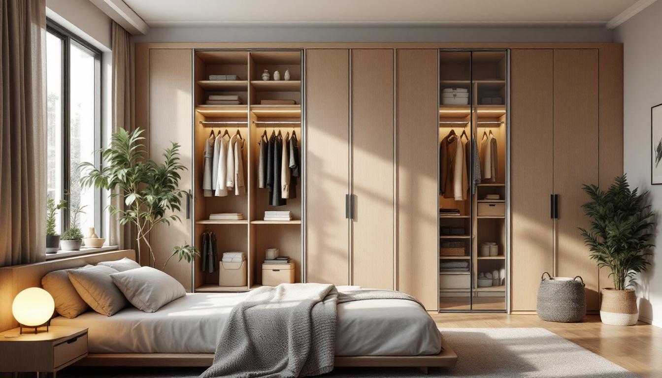 Estéticamente, un vestidor cerrado puede integrarse con el diseño general del dormitorio, usando puertas con acabados que combinen con el mobiliario o incluso puertas espejadas que amplían visualmente el espacio.
